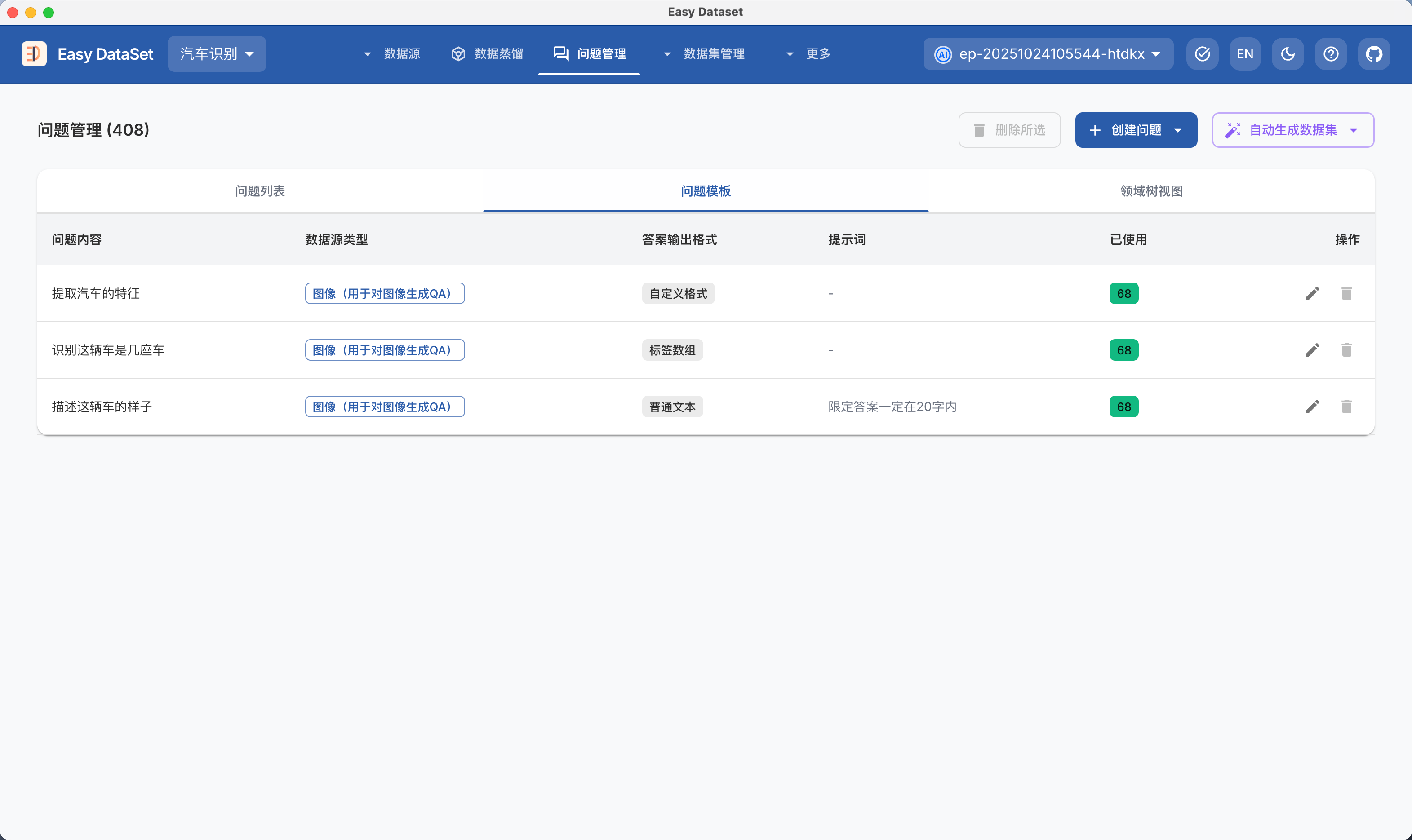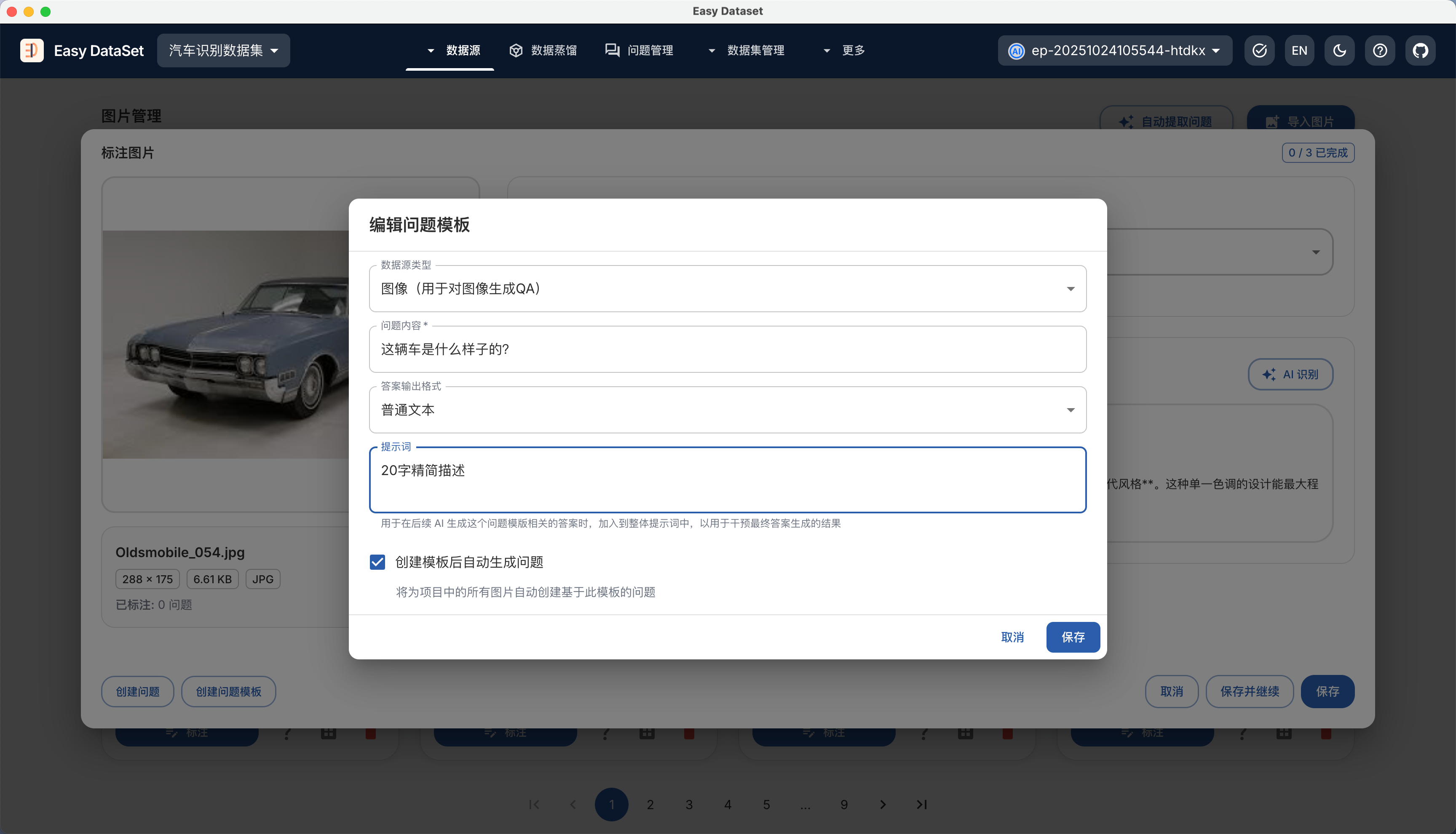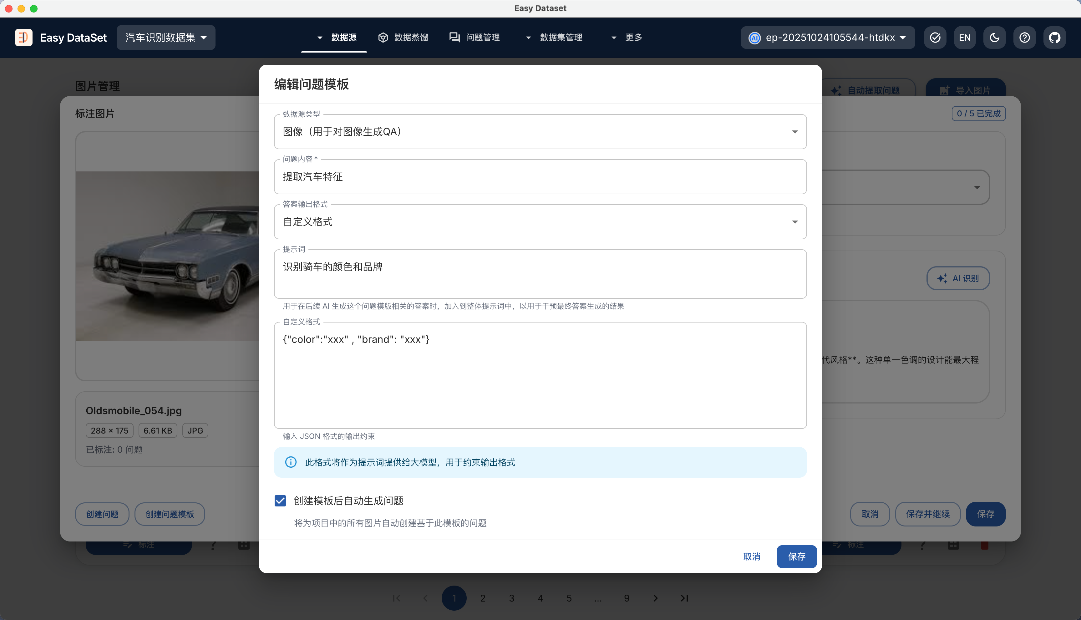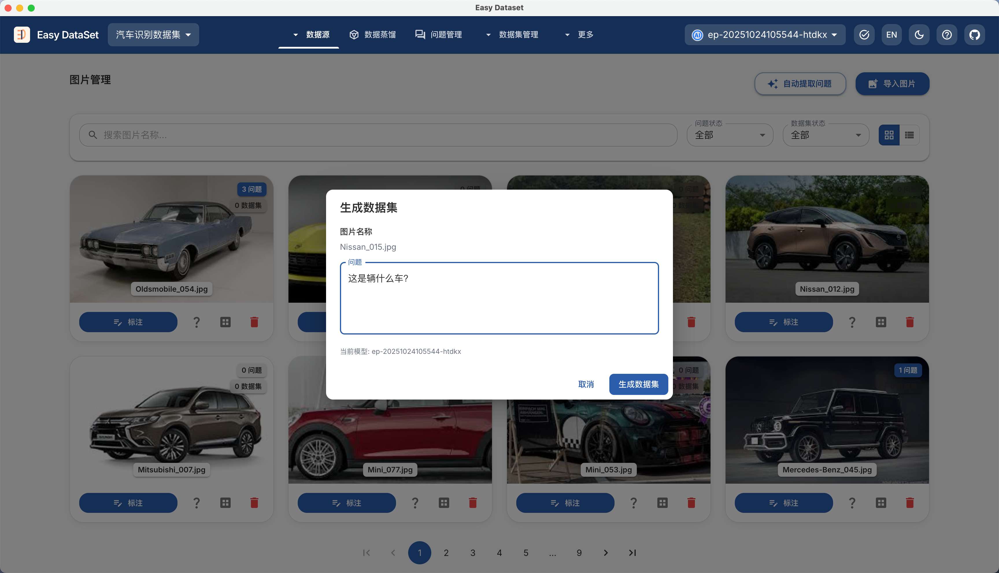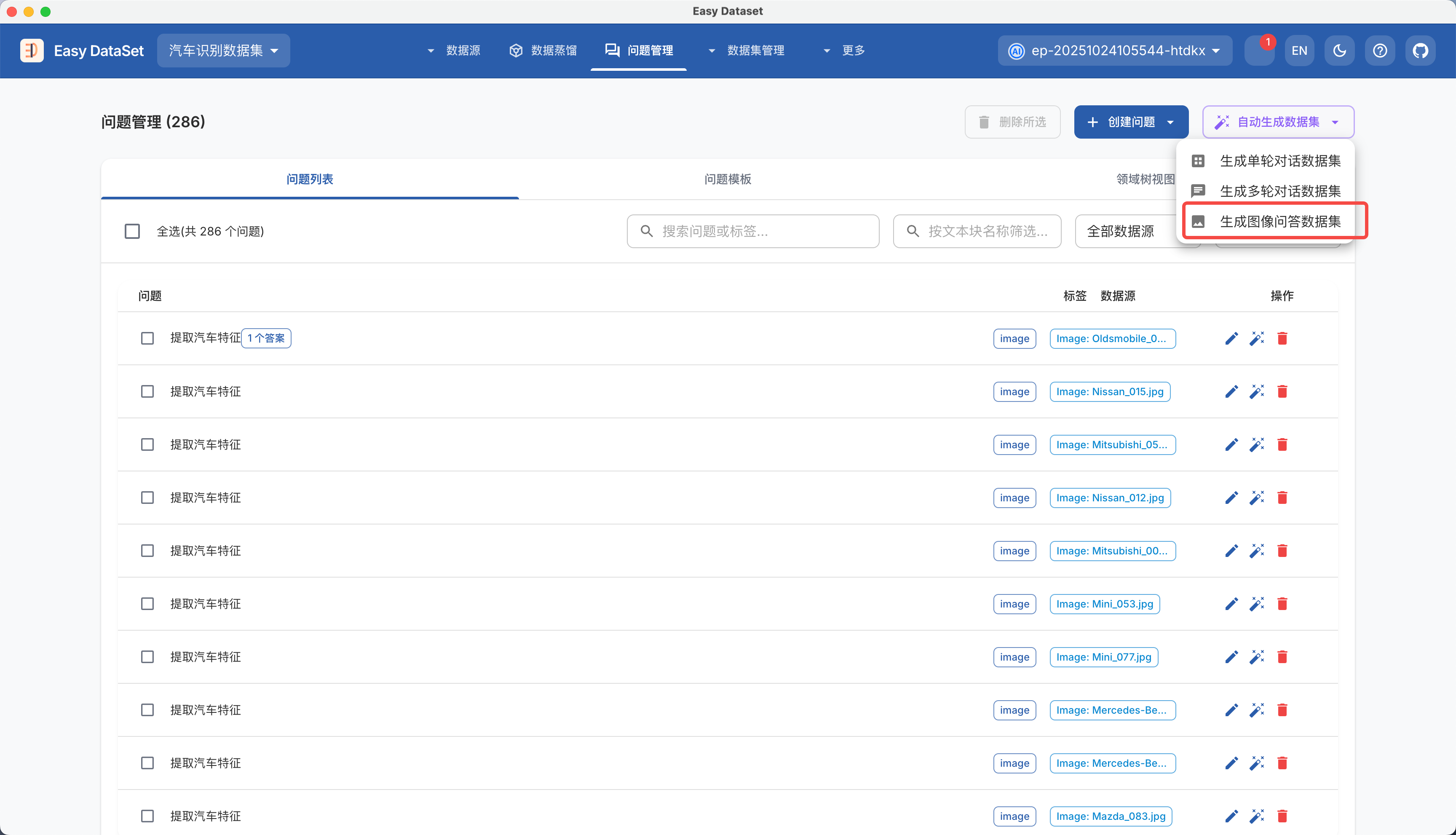 如果嫌手动标注太慢,可以到问题管理模块,点击自动提取数据集 - 生成图像问答数据集,这会自动创建一个后台异步任务: