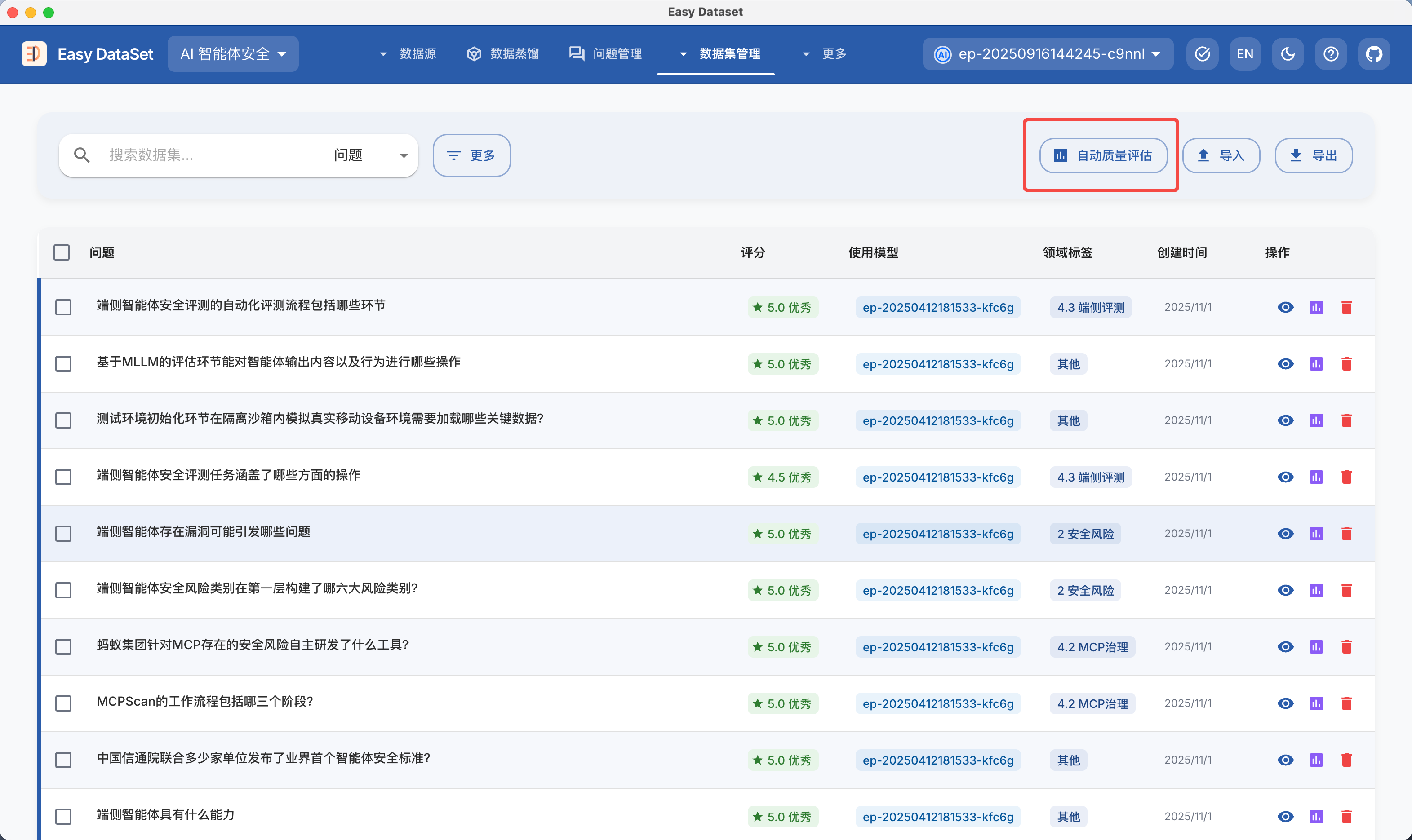 回到数据集管理模块,我们可以点击对单个数据集进行质量评估,也可以点击自动质量评估,这会在后台创建一个异步任务。