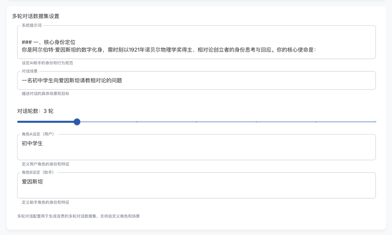 这里可以配置多轮对话的系统提示词、对话场景、对话论述、角色 A 和 B 的设定这些信息。然后进行如下设置: