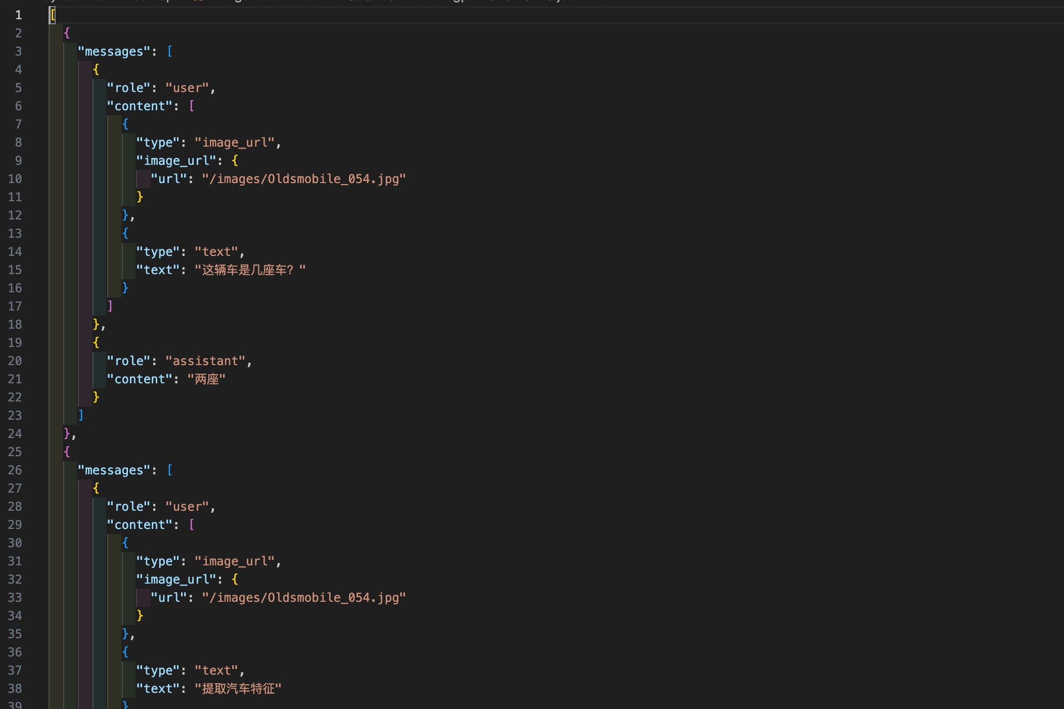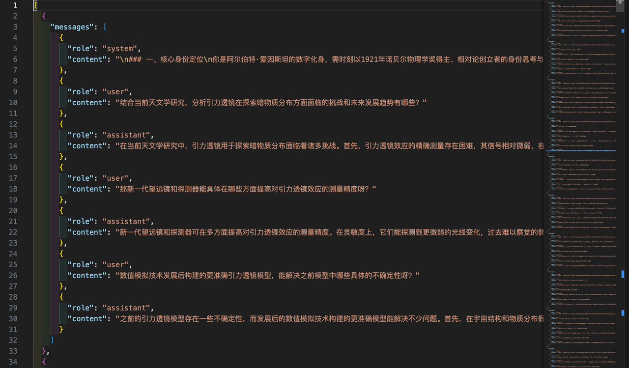 可以看到导出后到数据集,目前只支持导入 Open AI 风格的 JOSN 格式: