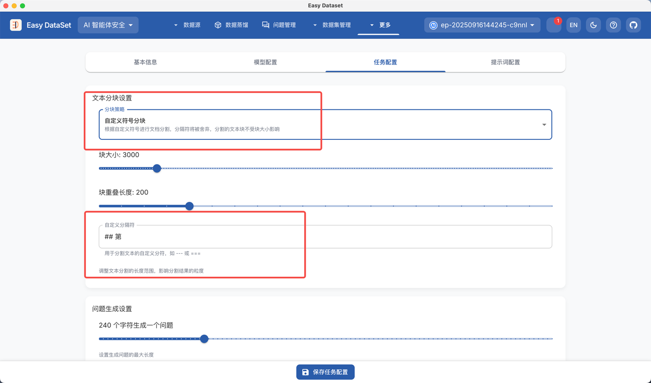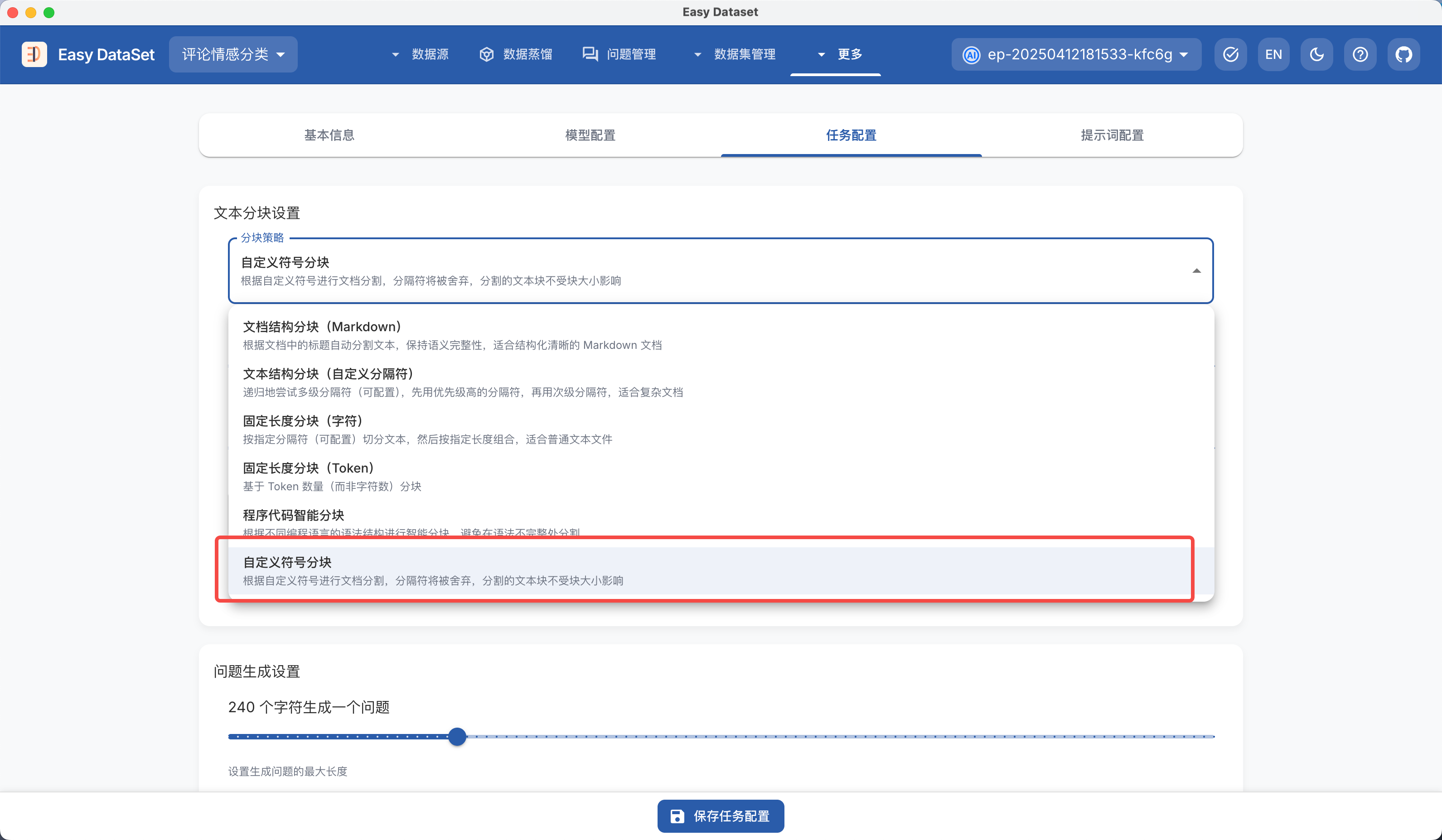 在 EDS 中,我们首先要在任务设置中将分块策略改为 “自定义符号分块” (在自定义分隔符处输入:---------),这种策略会严格按照给定的分割符进行分块,并且会忽略分隔符,不受文本块的大小限制: