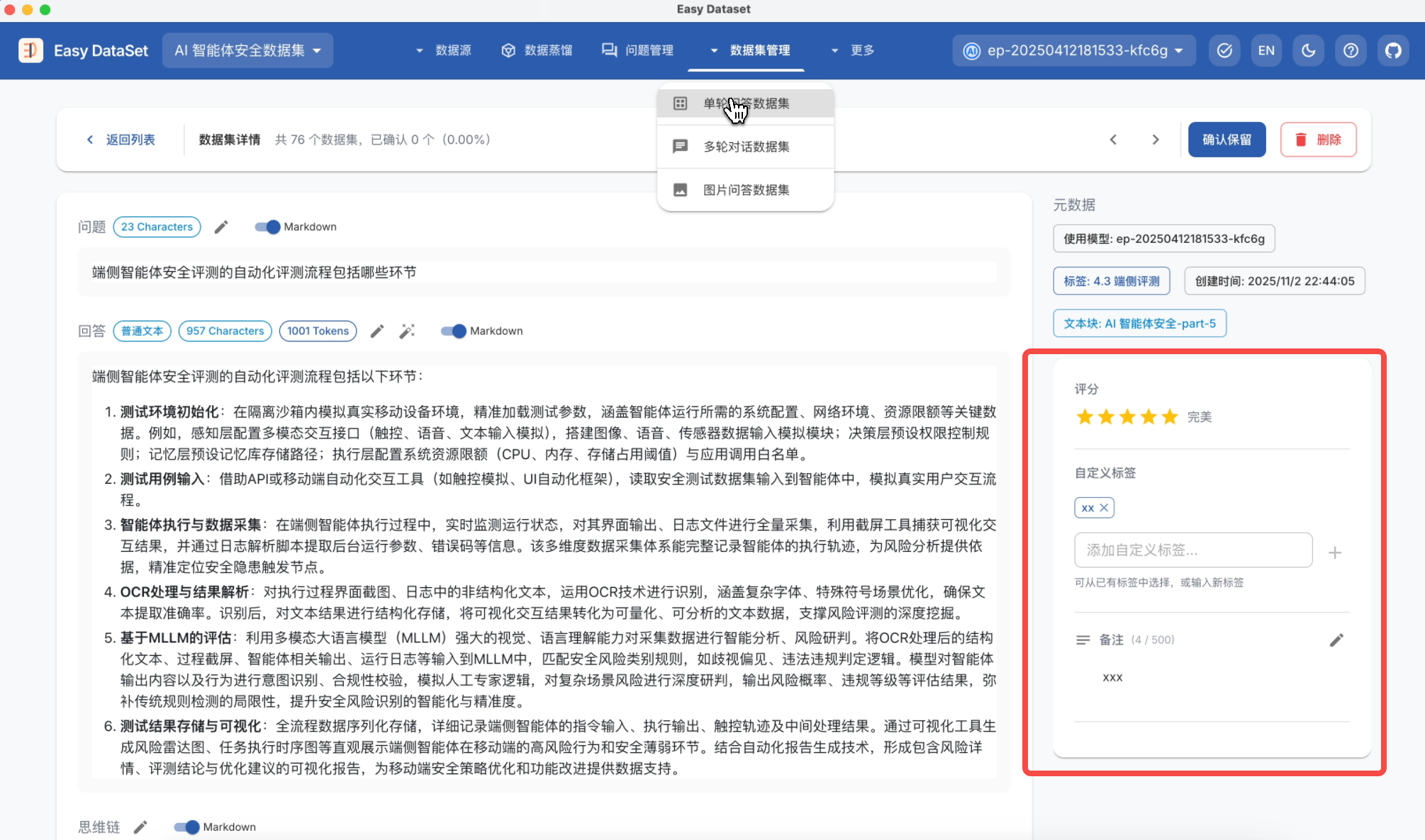 点击数据集详情,可以对答案进行更改,自定义评分、自定义标签、备注等标注操作: