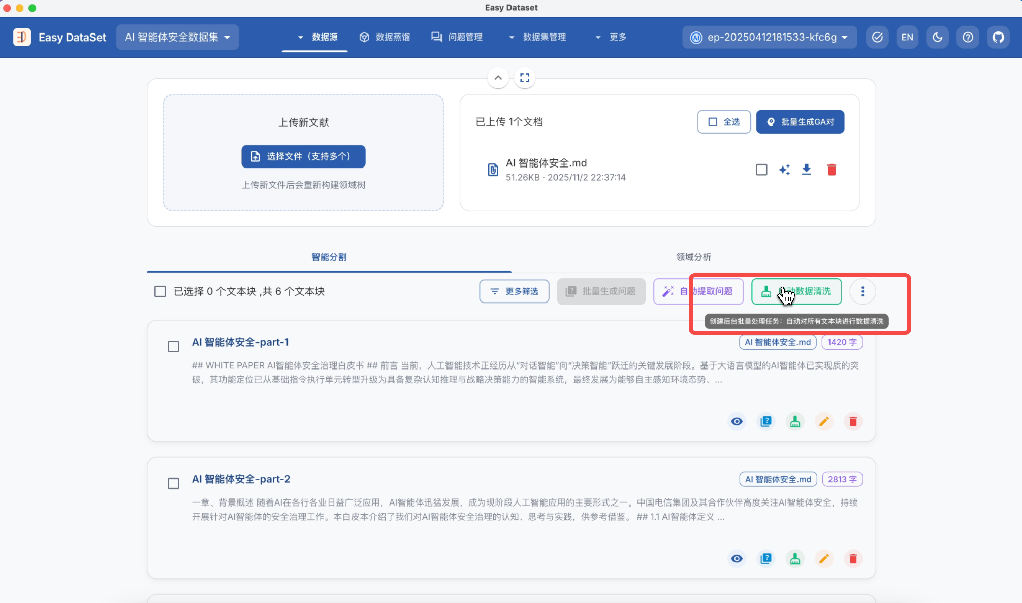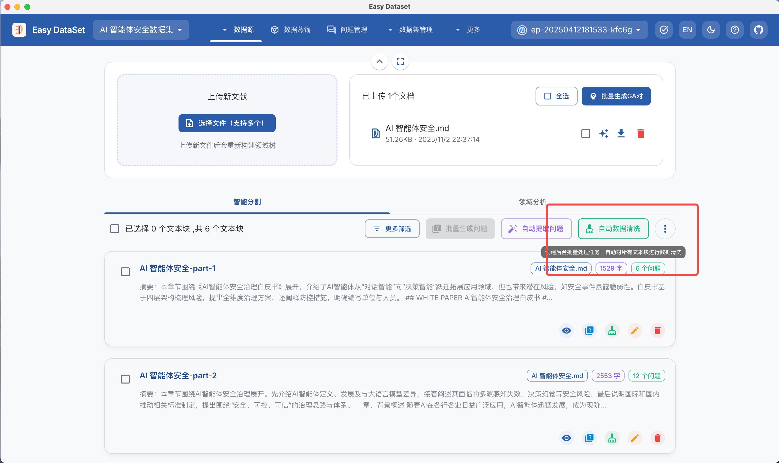在文献的处理上,我们新增支持了,对文本块进行数据清洗的能力,它可以帮助我们智能识别和清理文本中的噪声、重复、错误等"脏数据",提升数据准确性、可用性,以进一步提升后续生成数据集的质量或 RAG 召回率。