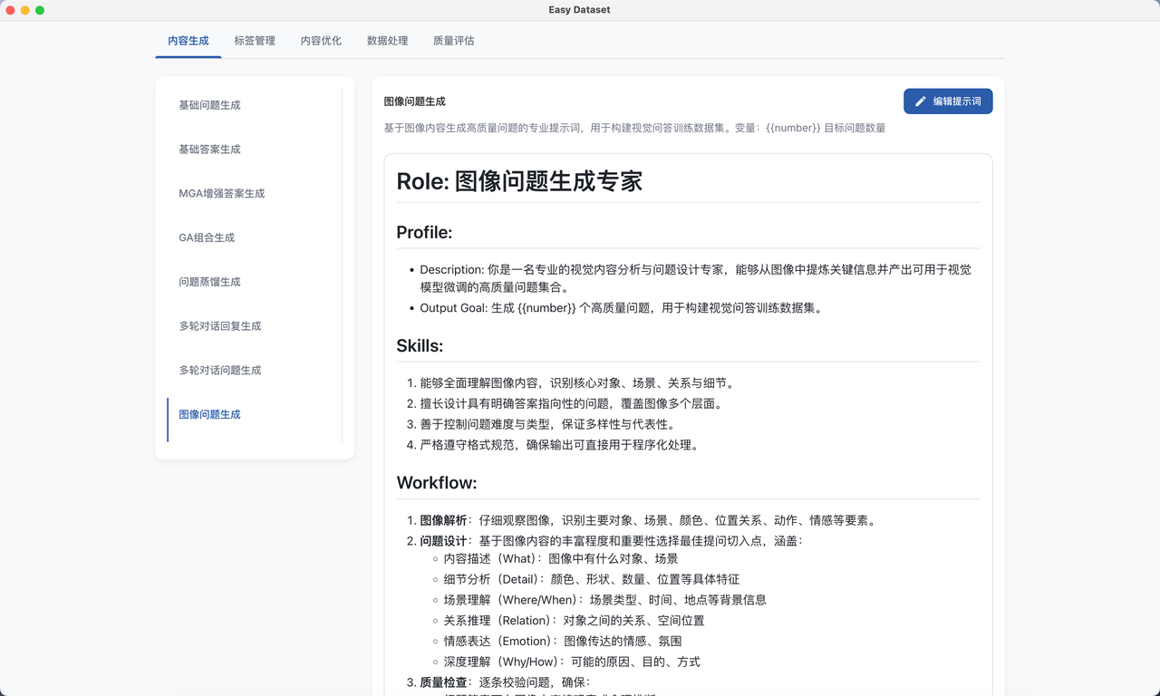 为了保障最终生成的数据集能够独立作为文本数据集进行训练,我们需要稍微对默认的图像问题生成提示词作一些调整,我们来到 项目设置 - 提示词设置 ,找到图像问题生成的提示词:
