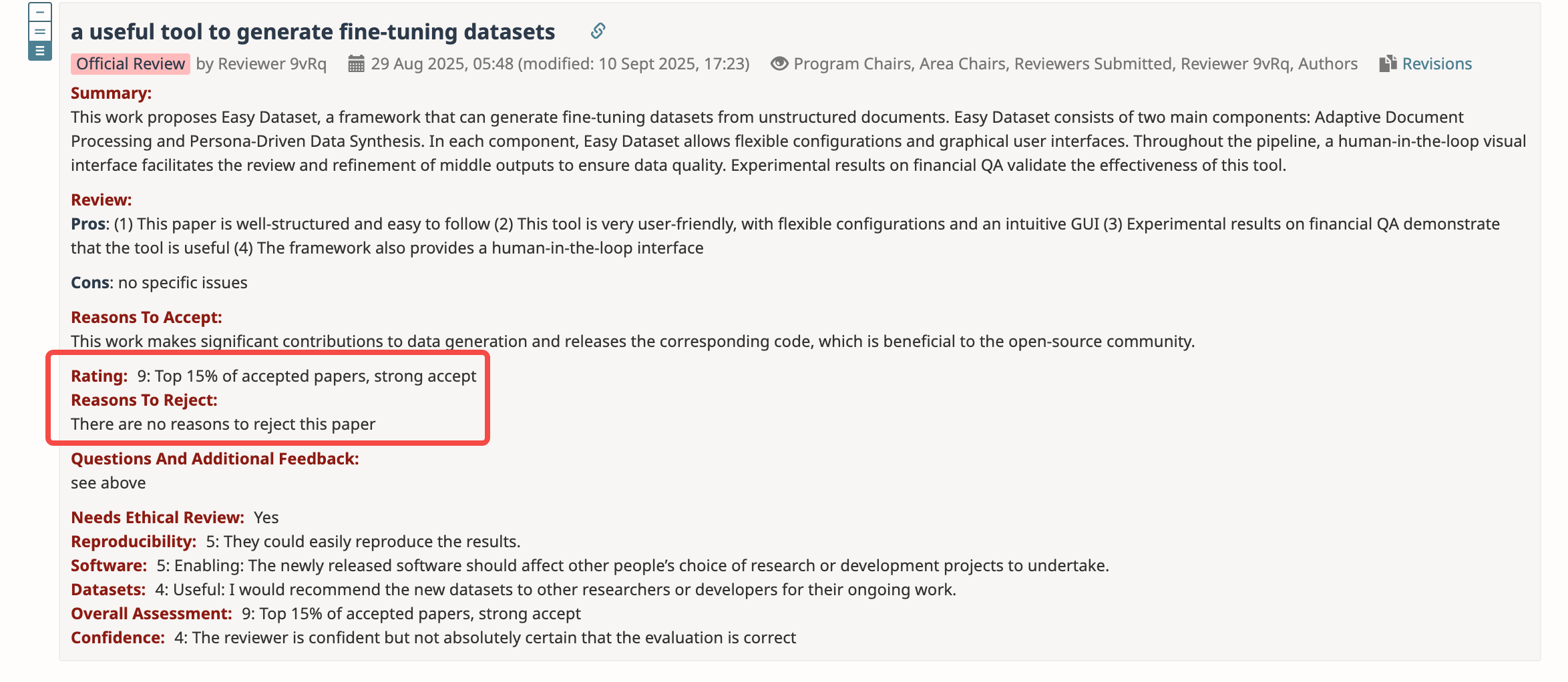 另外,Easy Dataset 论文已被 EMNLP 2025(人工智能领域顶级会议)接收,并且将在今年的 EMNLP 2025 System Demonstration 区域展出。