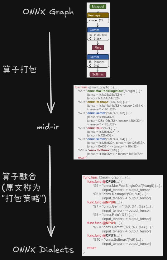 graph -> onnx dialect 过程,不仅进行了lowering,还有算子打包(分配到不同的设备某号CPU和某号NPU)和算子融合(中间结果采用缓存存储,避免频繁读写内存)