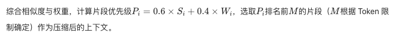 当 Agent 处理长流程任务(如分析 1 个月的生产日志)时,上下文长度易超过大模型 Token 限制(如 GPT-3.5 为 4k Token),需通过压缩算法筛选关键信息。本文采用 “余弦相似度 + 关键词权重” 的混合压缩方案,公式如下: