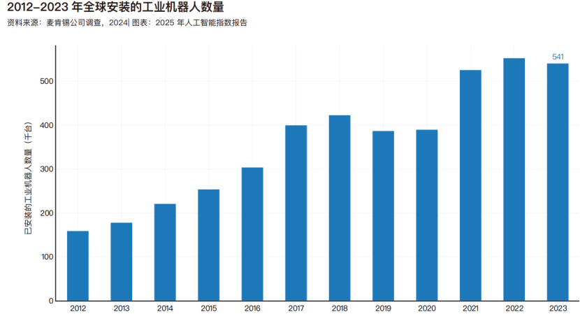 下图按年份呈现全球工业机器人的年度安装总数(非累计量)。数据显示,2023 年全球工业机器人安装量出现小幅回落,是自2019 年以来,该指标首次出现年度同比下降,从侧面反映出全球制造业自动化需求的阶段性调整。