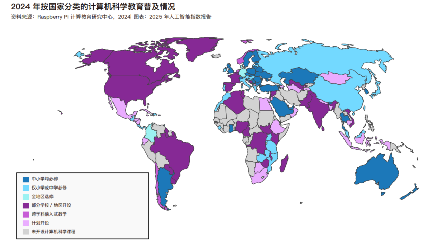 2024 年全球约三分之二国家已实施或计划实施计算机科学教育,其中 30% 的国家将其设为中小学必修课程,欧洲是这类国家最多的地区。过去五年各大洲推广该教育均有进展,非洲和拉丁美洲增长尤其明显,但非洲学生仍是全球最难获得该教育机会的群体,核心原因是基础设施不足 ——2023 年撒哈拉以南非洲仅 34% 的小学有电力,这既限制了学生计算机基础技能培养,也阻碍了计算机科学与人工智能课程的开展。
