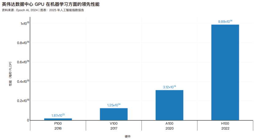 我们先来看大模型训练的核心基石:英伟达 GPU 芯片的性能迭代。从数据来看,其性能提升幅度十分显著,这一变化高度契合摩尔定律的规律,即每隔 18 到 24 个月,芯片的性能大约提升一倍。