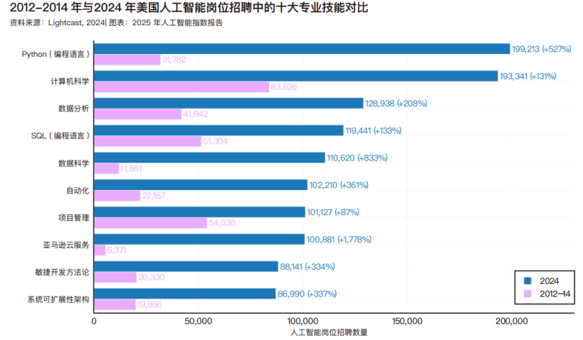 从下图能清晰看到:2024 年 AI 岗位最缺的 10 项技能,和 2012 到 2014 年比,过去十年里每一项的需求都涨了。其中 Python 涨得特别猛,这也能看出来它现在就是 AI 领域的首选编程语言。这些信息希望能帮大家选专业、学技能时更有方向。