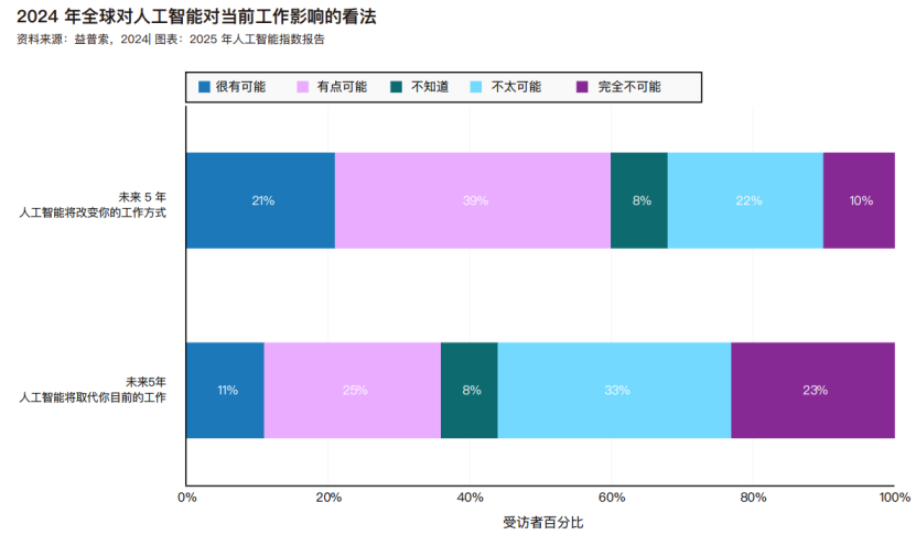 - 下图则展示了全球公众对“AI 将改变工作方式或取代现有岗位” 的预期。60% 的受访者认为,未来五年内人工智能 “可能”