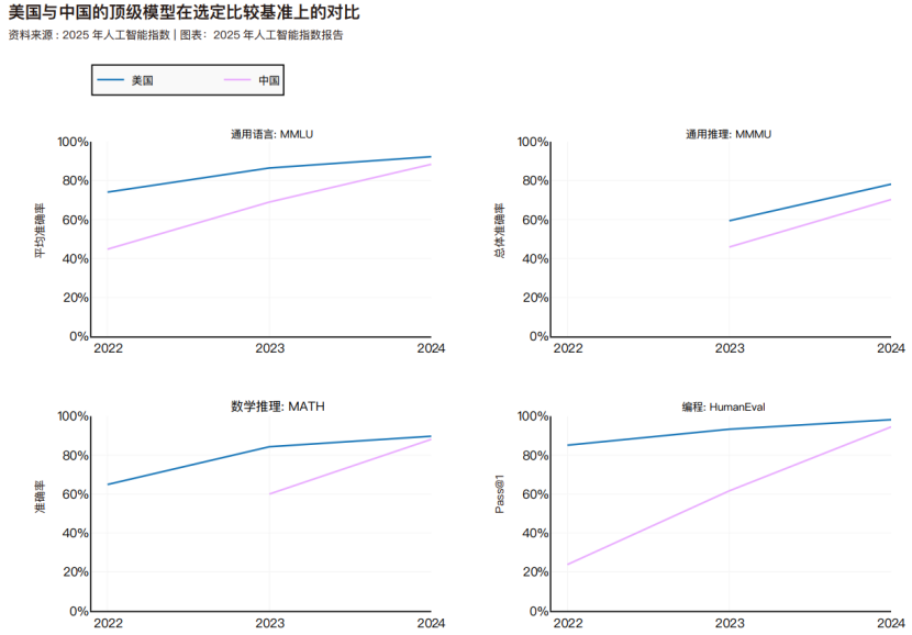 曾在2023 年以显著优势领跑的美国顶尖 AI 模型,如今已无法维持与中国同类产品的差距。从下图可以看得出,截至2023 年底,在 MMLU、MMMU、MATH 和 HumanEval 等比较基准中,中美模型的性能差距分别为 17.5、13.5、24.3 和 31.6 个百分点;而到 2024 年末,这些差距已大幅收窄至 0.3、8.1、1.6 和 3.7 个百分点。