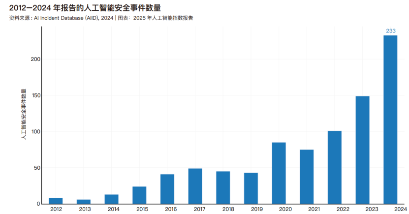 2024 年全球人工智能相关事件数量迎来爆发式增长,达到 233 起的创纪录水平,较 2023 年大幅攀升 56.4%。这一增长可能既反映了人工智能应用的扩大,也反映了公众对其影响的关注度提升。此外,对人工智能认知度的提高可能也促使更多事件被上报至相关数据库。