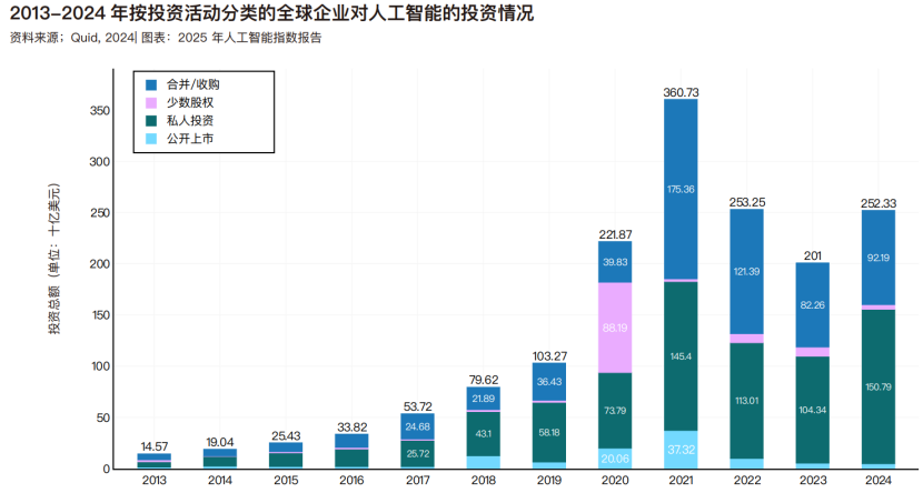 从下图能清晰看到 2013-2024 年全球企业 AI 投资的变化:涵盖并购、私人投资等四大类型,2024 年总投资额冲到 2523 亿美元,比 2023 年涨了 25.5%,其中私人投资最猛,同比涨了44.5%。从长期维度看,2013 至 2024 年十余年间,全球 AI 相关投资规模已增长近十三倍,印证了该领域从技术探索到规模化落地的爆发式发展轨迹。