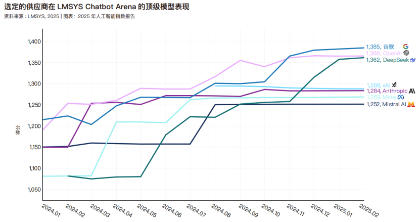 若从厂商机构维度进一步分析,下图显示:各家厂商的顶级模型性能正逐步趋同,其中谷歌、OpenAI 与 DeepSeek(品牌名规范首字母大写)属于第一梯队。需要说明的是,本结论基于LMSYS Chatbot Arena数据 —— 该平台由国际开放研究组织 LMSYS(全称 Large Model Systems Organization,由加州大学伯克利分校、斯坦福大学等高校研究者主导)开发,是全球领先的大语言模型(LLM)实时评测工具。