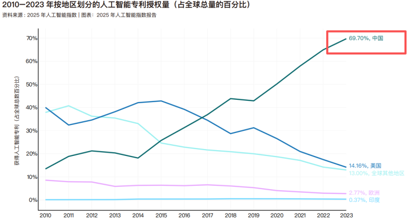 看完产业界的动态,再将目光转向学术界。从报告数据来看,中国在AI 研究论文总量和专利授权数量方面,目前处于领先地位。