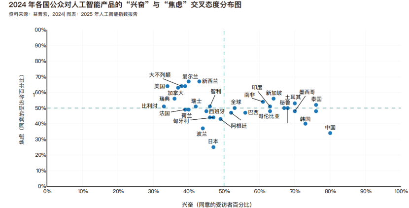 - 下图呈现了不同国家受访者对人工智能的“兴奋感” 与 “焦虑感”
