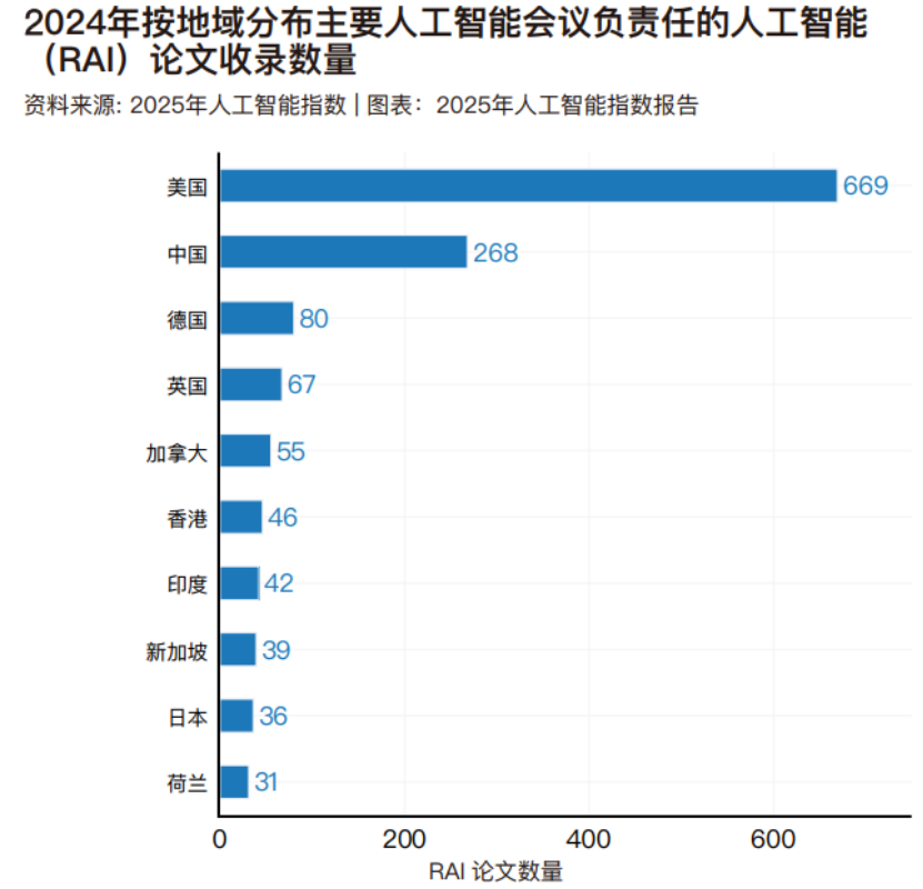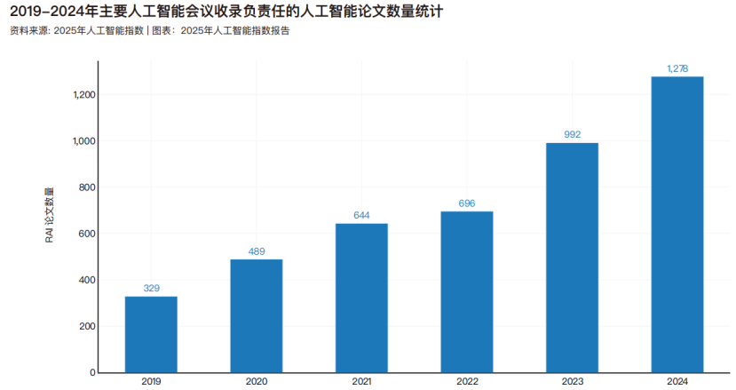 好在研究端有了起色:2023 年起,顶级会议上的 RAI 论文明显变多,2024 年更是涨到 1278 篇,同比多了 28.8%,说明大家开始重视了。