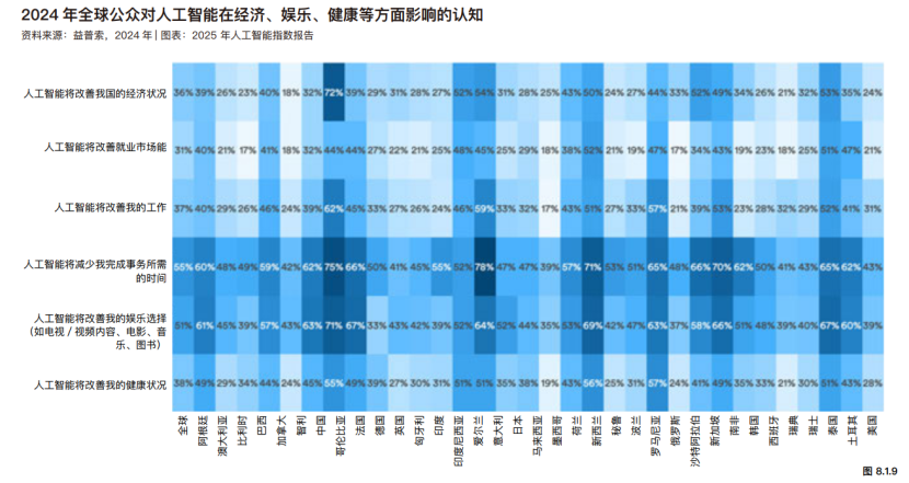 从全球平均来看,38% 的受访者认为 AI 将改善健康。其中,墨西哥受访者乐观度最高,达 56%;日本则最低,仅 19% 的受访者持此观点。