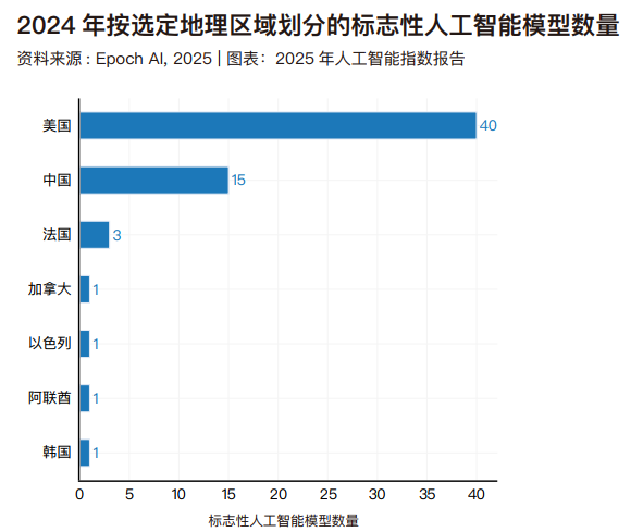 从国家维度具体拆分来看,美国在标志性 AI 模型的发布上优势显著,以 40 个的数量遥遥领先;中国紧随其后,共发布 15 个;法国则以 3 个的数量位居第三。
