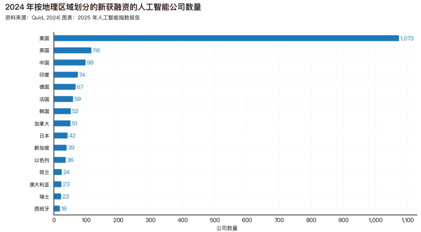 从下图能看到不同地区新拿到投资的 AI 公司数量,这个趋势和私人投资特别像:美国最多,有 1073 家新获投公司;接下来是英国,116 家;中国排第三,98 家。这一数据差异背后,反映出美国 AI 创业生态的成熟度 —— 其本土不仅有充足的风险资本供给,还依托硅谷、波士顿等科技集群形成 “技术 - 人才 - 资本” 的闭环,吸引了大量早期 AI 创业项目落地,而中英等国虽在特定领域(如中国的 AI 应用层、英国的 AI 科研转化)表现活跃,但整体新创公司数量仍与美国存在差距。