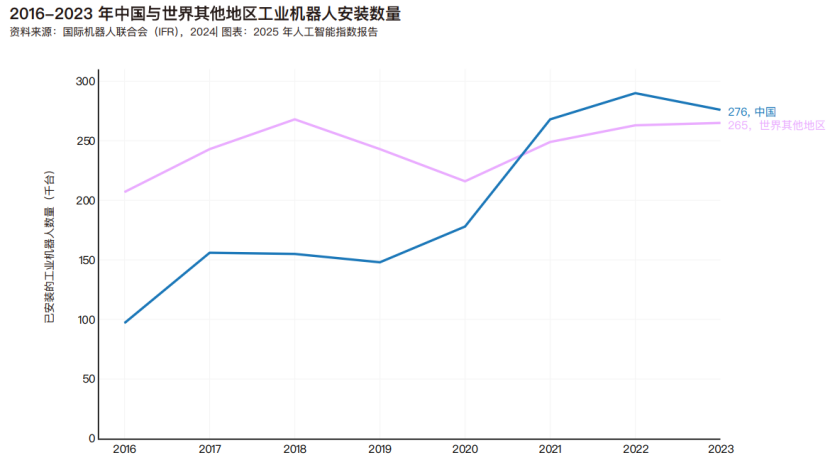 下图更直观地呈现了“中国与全球其他地区的安装量对比”(中国单挑全世界)。数据显示,自 2021 年起,中国工业机器人年度安装量已持续超过全球其他所有地区的总和;即便 2023 年这一领先优势较 2022 年略有收窄(主要因全球制造业自动化需求阶段性波动),但增速放缓仅为短期调整,并未动摇中国的绝对主导地位。