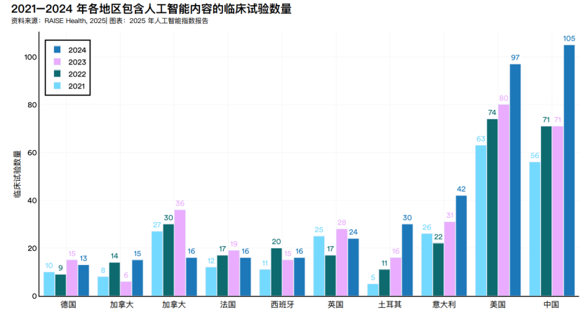 全球 AI 驱动的临床试验数量激增,2024 年中国(105 项)、美国(97 项)、意大利(42 项)位列前三。