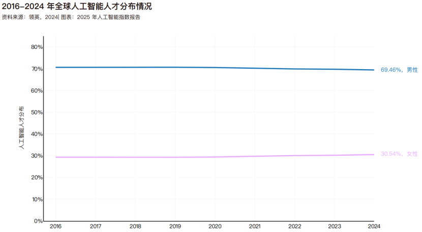 领英也在跟踪 AI 人才的性别分布情况。2024 年的数据估计显示,平台上 69.5% 是男性 AI 专业人员,女性占 30.5%,而且这一比例这些年一直比较稳定。简单说就是,AI 领域的性别构成暂时没出现大的变化。