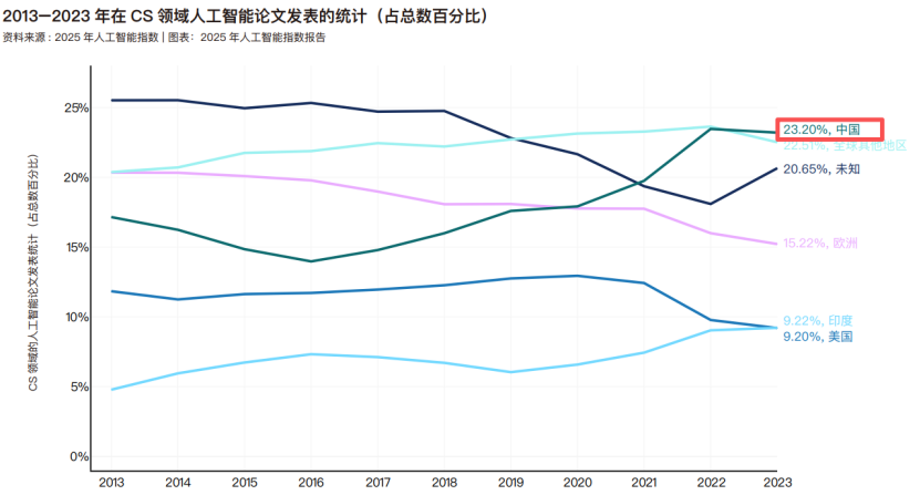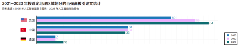 与之相对,美国则在高影响力研究领域(highly influential research)占据明显优势。2021 年至 2023 年,美国始终是 AI 领域被引用论文最多的国家,具体数据为 2021 年 64 篇、2022 年 59 篇、2023 年 50 篇。尽管这一数量呈现逐年小幅下降的趋势,但美国在该领域的总量依旧保持领先。