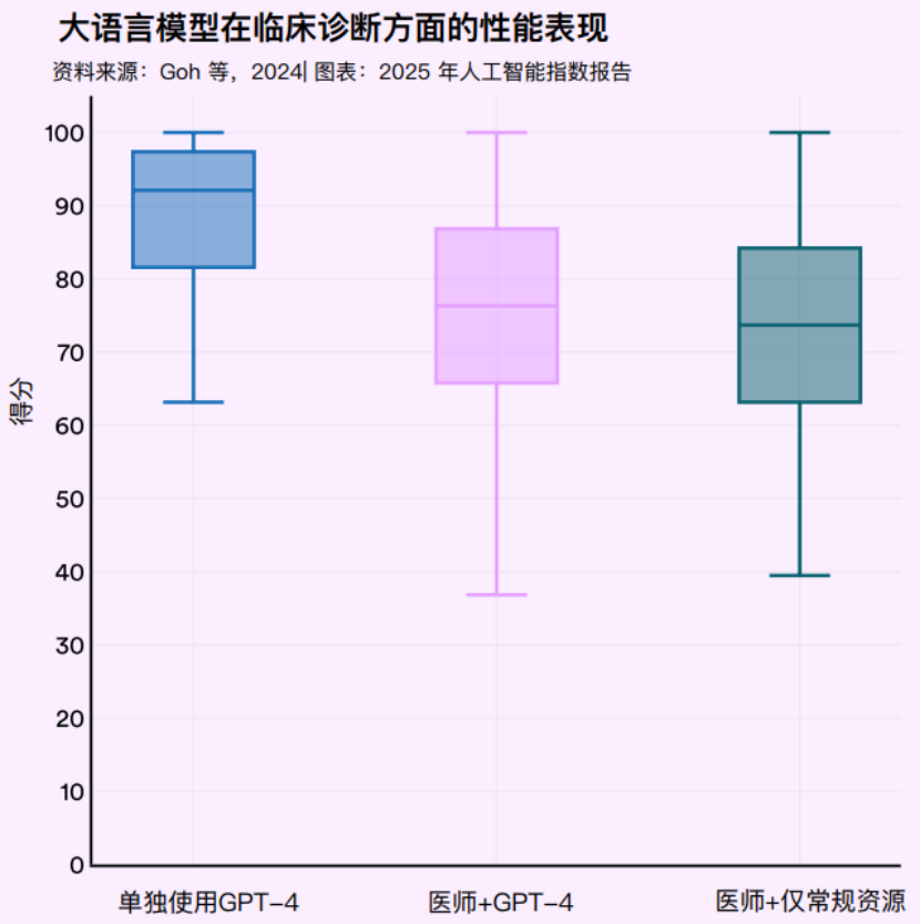 结果分两部分:一是医生用GPT-4 辅助时,诊断准确率 76%,只比用传统工具的医生(74%)高一点,且两组医生完成病例的时间没差别,没体现出效率优势;二是单独用 GPT-4 时,诊断推理得分达 92%,比不用 AI 的医生高 16 个百分点,表现反而更好。