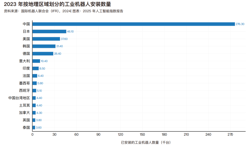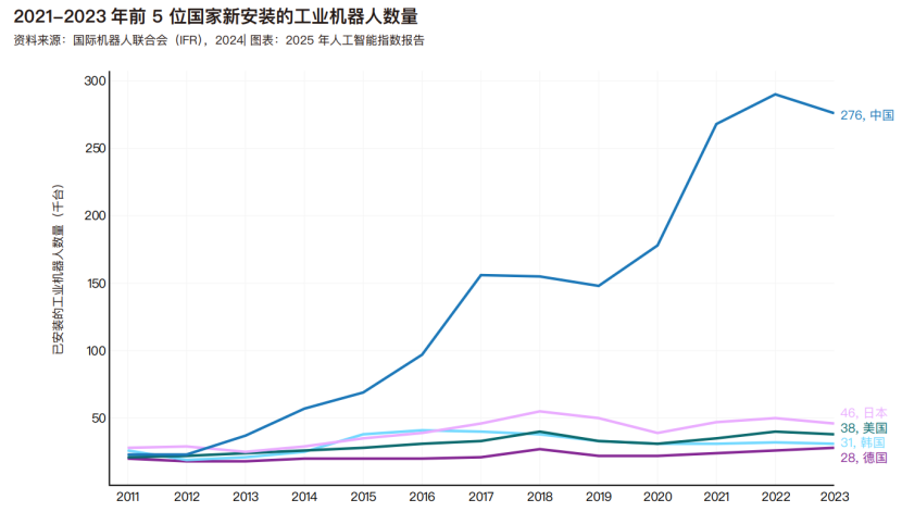 前文已从全球整体视角分析了工业机器人安装趋势,接下来聚焦国家与地区维度—— 各国工业机器人安装量,是衡量其对机器人技术应用重视程度及制造业自动化水平的关键指标。2023 年全球统计数据显示,中国以 27.63 万台(原文 276,300 台)的工业机器人安装量稳居全球首位,规模优势显著:分别是日本(4.61 万台,原文 46,100 台)的 6 倍、美国(3.76 万台,原文 37,600 台)的 7.3 倍,且中国单国安装量已占 2023 年全球总量(54.1 万台)的 51.1%,成为推动全球制造业自动化转型的核心力量。