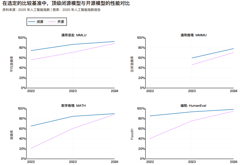 在了解上述评测基准后,结合下图可清晰看到:自DeepSeek时刻起,开源模型的评测指标已持续逼近闭源模型。