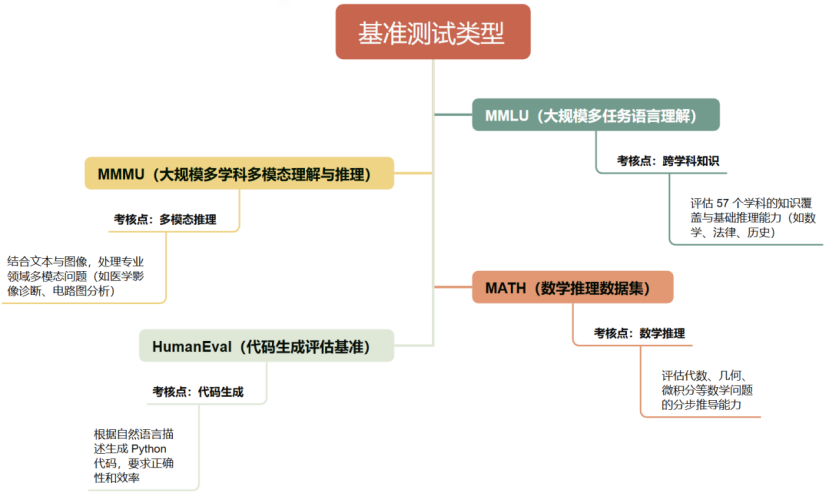 先给大家简单科普一下国际上大模型的通用基准测试—— 这些测试是评估模型不同维度能力的重要工具,各自有明确的考核方向。