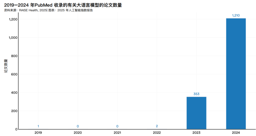 近年来,学界对大语言模型在医疗任务中表现的评估兴趣大幅上升。这一点可以通过生物医学文献检索数据库PubMed 的检索数据印证 —— 在该数据库中搜索 “大语言模型”,共检索到 1566 篇相关论文,其中仅 2024 年一年就发表了 1210 篇,直观体现了领域关注度的爆发式增长。