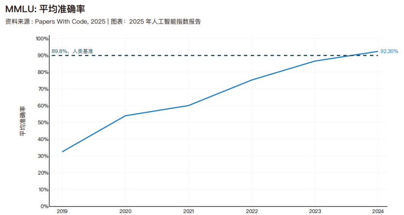 在完成各厂商模型性能的横向对比后,我们可将视角转向另一维度:模型能力与人类基准的比较。如下图所示,数据清晰显示:大模型在语言理解能力上已超越人类设定的能力基准。