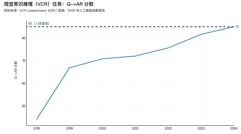 在推理能力维度,大模型的得分虽仍低于人类专家的中高水平基准,但正以较快速度缩小二者之间的差距。