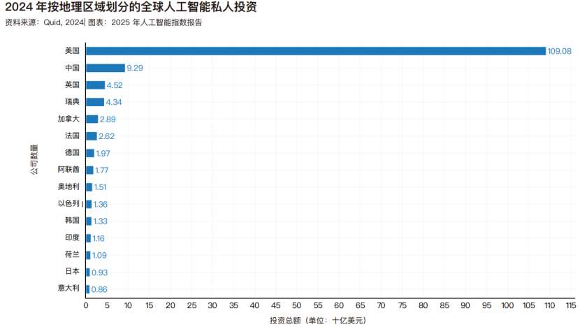 2024 年全球 AI 私人投资的榜首还是美国,而且领先优势特别大。数据显示,它当年投了 1091 亿美元,是第二名中国(93 亿)的 11.7 倍,更是英国(45 亿)的 24 倍多。另外,前15 名里还有几个欧洲国家值得关注:瑞典投了 43 亿,奥地利 15 亿,荷兰 11 亿,意大利 9 亿,能看出来除了中美英,欧洲也有不少国家在发力 AI 投资。
