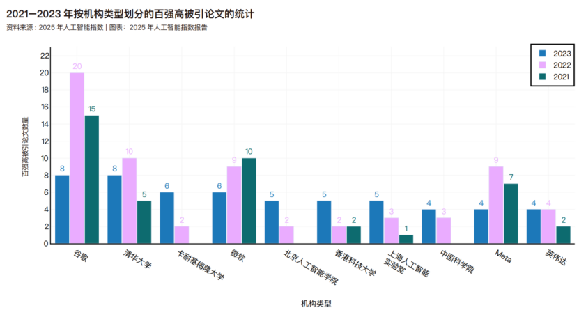 从机构维度来看,在高质量 AI 论文的产出中,美国与中国的学术机构依旧占据主导地位,两者的贡献占比显著高于其他国家的机构。