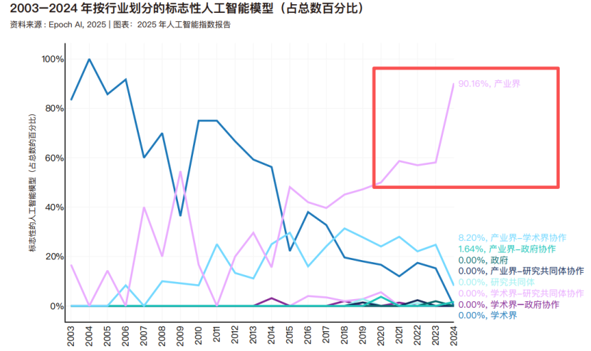 先看产业界的表现,有一个趋势很明显。2024 年,近90%的“标志性模型”(即具有高度影响力的 AI 模型)源自产业界,这一比例在 2023 年还是 60%,增长势头非常突出。下方这张图能直观体现:从 2021 年起,在“标志性模型”的发布上,产业界主导开发的模式,就已遥遥领先于其他模式(比如企业与学术合作、企业与政府合作,或是学术界主导开发等)。