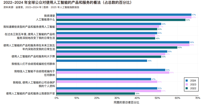 但调查也显示出人们日益增长的担忧。过去一年里,相信人工智能企业会保护个人数据的受访者比例下降 3 个百分点;认为人工智能不会对任何群体产生歧视或偏见的受访者比例,同样下降 2 个百分点。