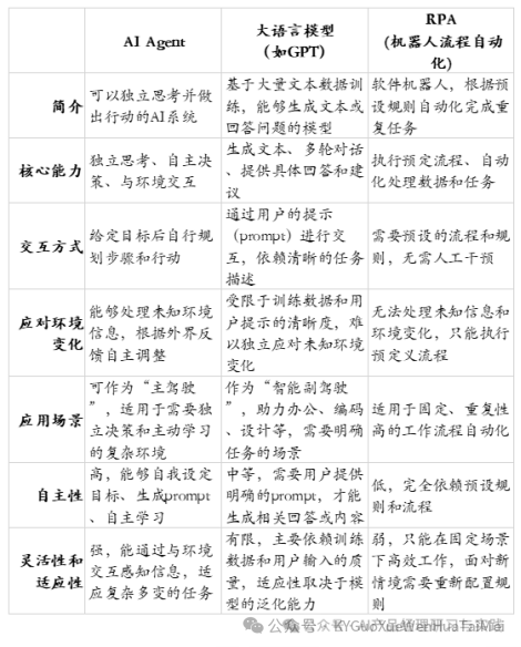 大语言模型和AI Agent 的区别在于 AI Agent 可以独立思考并做出行动,和 RPA 的区别在于它能够处理未知环境信息: