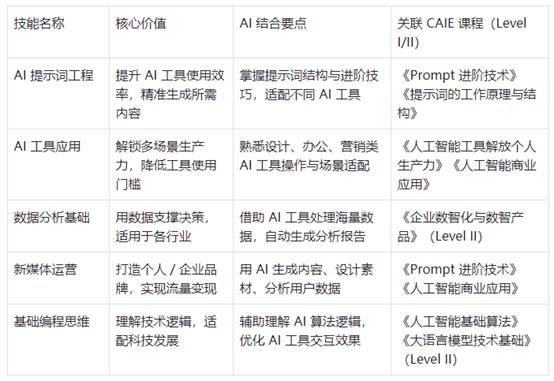 为清晰呈现各技能的核心价值、AI 结合方式及与 CAIE 课程的关联,以下通过表格先做整体概览,再展开具体说明。
