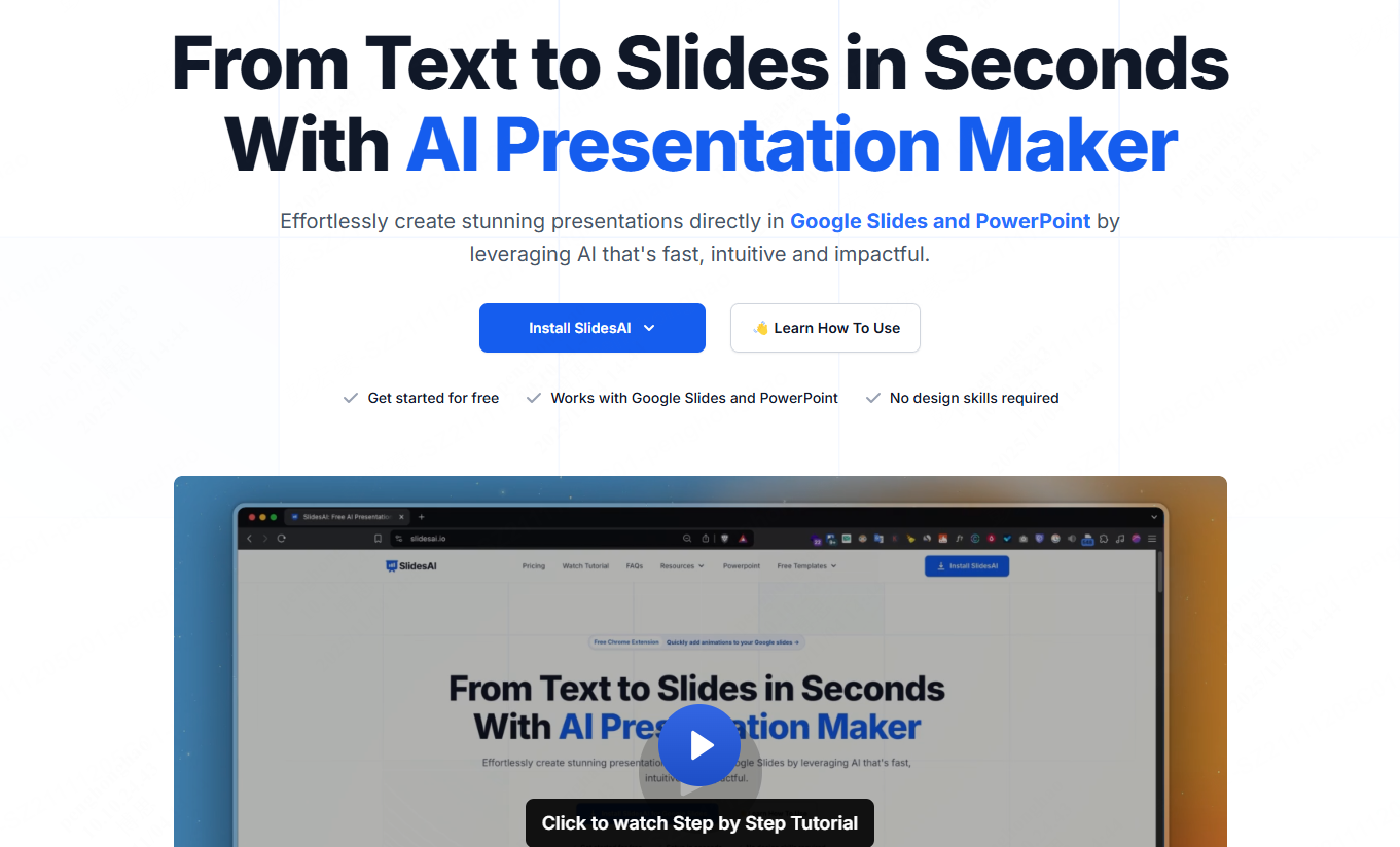 SlidesAI是一款专注于与Google Slides和PowerPoint无缝集成的AI演示文稿生成工具。它的最大特点是,你可以在你已经熟悉的平台上直接使用AI功能,无需学习新的软件操作,极大地降低了上手门槛。你只需输入文本、脚本、笔记,甚至是一个链接,SlidesAI就能为你自动生成演示文稿。