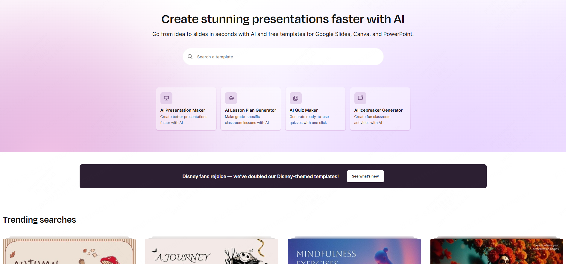 Slidesgo是一款广受欢迎的免费AI演示文稿制作工具,它与Google Slides和PowerPoint保持良好兼容,为教师、学生和企业用户提供了一个快速、高效的幻灯片创作解决方案。你只需输入一个主题,Slidesgo就能在几秒钟内为你生成一份视觉效果出色的演示文稿。
