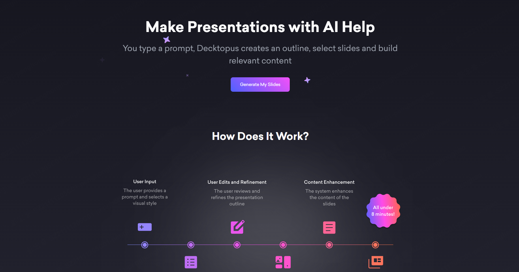 Decktopus将自己定位为你的AI演示文稿助手,它能够在8分钟内帮助你完成一份完整的演示文稿。你只需输入一个提示,Decktopus就会为你创建大纲、选择幻灯片并构建相关内容,整个过程高效而智能。Decktopus的目标是让你告别为了制作糟糕幻灯片而浪费时间的困境。