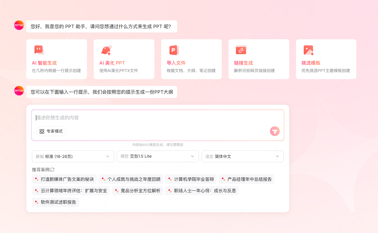 博思AIPPT作为一款新兴的AI智能PPT生成平台,致力于通过深度学习技术,实现从内容构思到视觉呈现的全流程自动化。你只需要输入一个主题、上传一份文档或是粘贴一个链接,博思AIPPT就能迅速为你生成一份专业级的演示文稿。对于那些希望从繁琐的PPT制作中解放出来的职场人士和学生而言,博思AIPPT无疑提供了一个高效的解决方案。