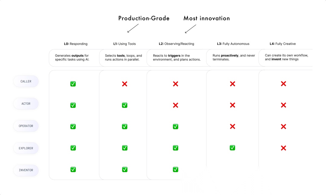 正如自动驾驶汽车必须依次掌握车道保持、自适应巡航和自动泊车,才能迈向L3及以上级别,AI智能体的发展也遵循同样的模式,每个层级都增加了更复杂的推理能力和独立性。