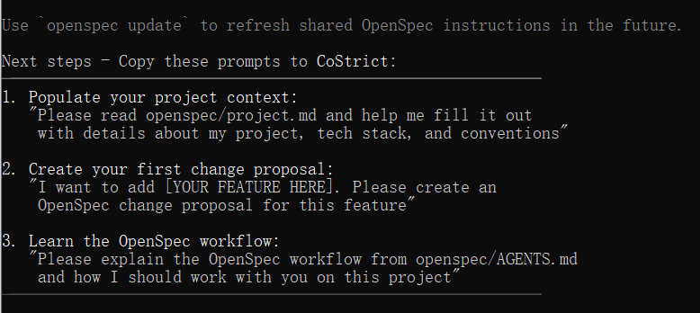 完成以上步骤后,你的 CoStrict 助手就已经具备了 OpenSpec 的“火眼金睛”,可以通过“/openspec-proposal”、“/openspec-apply”、“/openspec-archive”等命令调用OpenSpec进行规范化编程了。