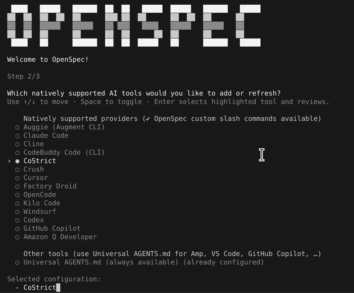 3. 在项目中初始化 OpenSpec 并选择 CoStrict: